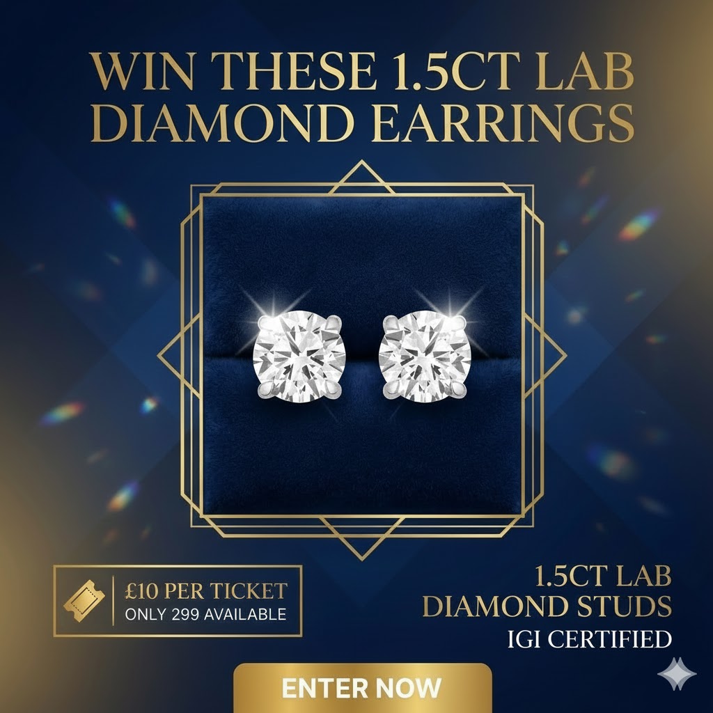 This is your chance to own a pair of 1.5 carat lab-grown diamond stud earrings, set in hallmarked 18ct White Gold – a timeless classic redefined with modern sparkle. Valued at £2,000.