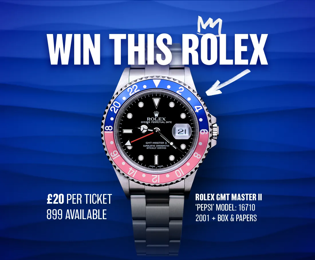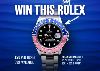 Win this ROLEX GMT MASTER II “Pepsi”- Model: 16710 – 2001 with Box & Papers in AMAZING Condition.
